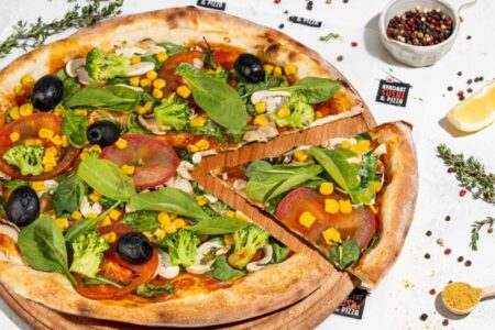 шпинат, шампіньйони, броколі, кукурудза, маслини, помідори, соус bbq