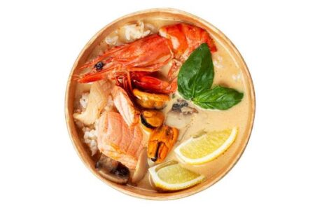 кокосове молоко, тигрові креветки, кальмар трубчастий, лосось, соєвий соус, шампіньйони, тайська паста (том ям), рибний соус, лимонна трава, листя кафіра, кунжут, рис, рукола, лимон