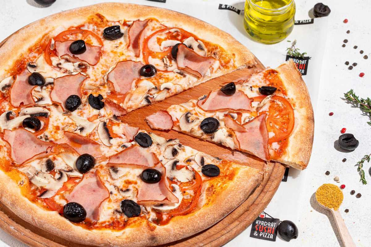 моцарела, шинка, помідори, шампіньйони, маслини, томатний соус