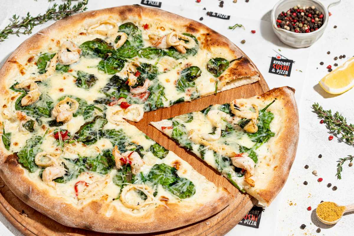 моцарела, мариновані креветки і кальмари, шпинат, часник, оливкова олія, пармезан, перець чілі, вершковий соус
