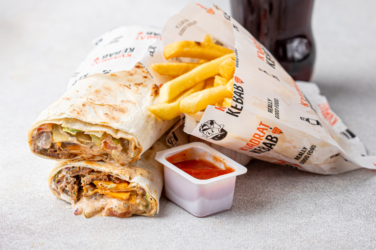• кебаб розмір M, картопля фрі, напій на вибір (Coca-Cola, Fanta, Sprite, Bonaqua)