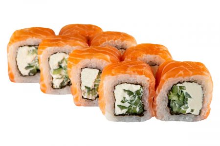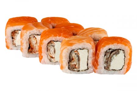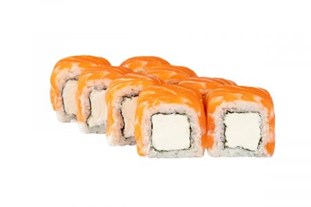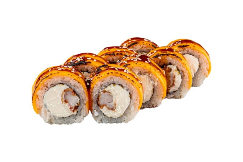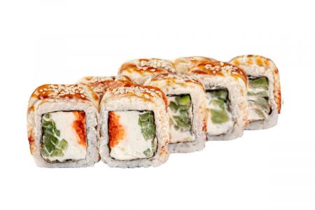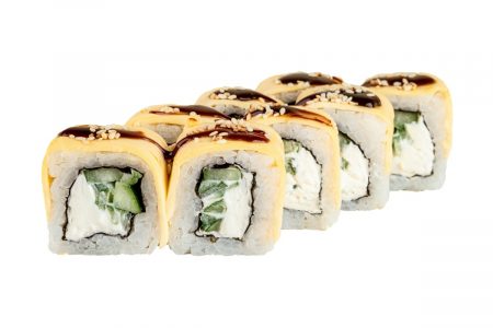 норі, рис, крем-сир, помаранчева ікра масаго, лосось теріякі, огірок, тостовий сир, соус унагі