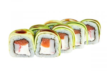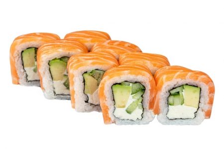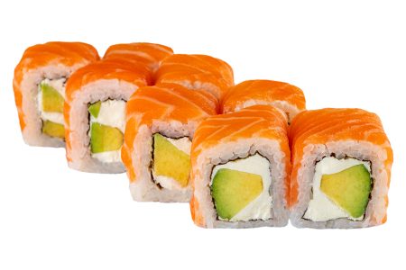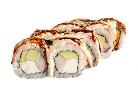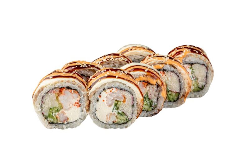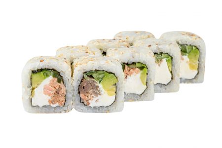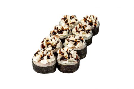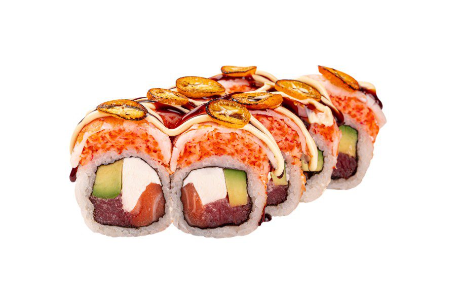 норі, рис, крем-сир, лосось, тунець, авокадо, заміс сніжного краба, помаранчева ікра масаго, креветка, японський майонез,…