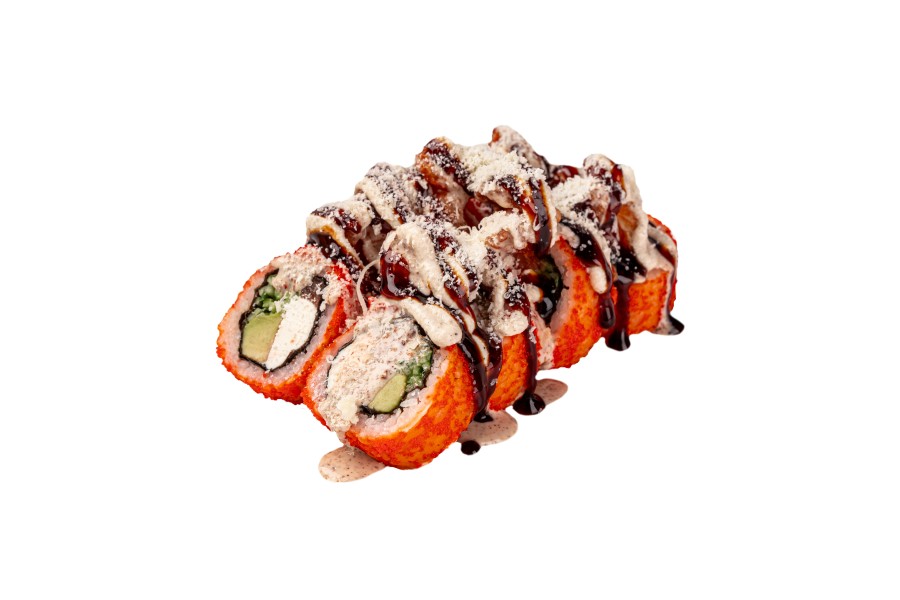 норі, рис, крем-сир, помаранчева ікра масаго, лосось, огірок, авокадо, смажена креветка, сирний соус, соус унагі,…