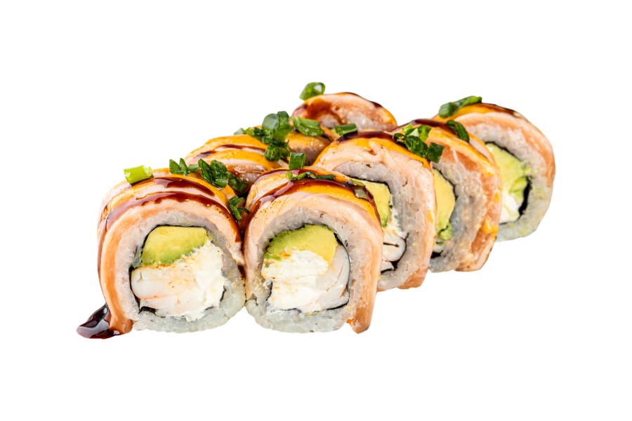 норі, рис, крем-сир, авокадо, креветка, лосось, соус спайсі, соус унагі, зелена цибуля