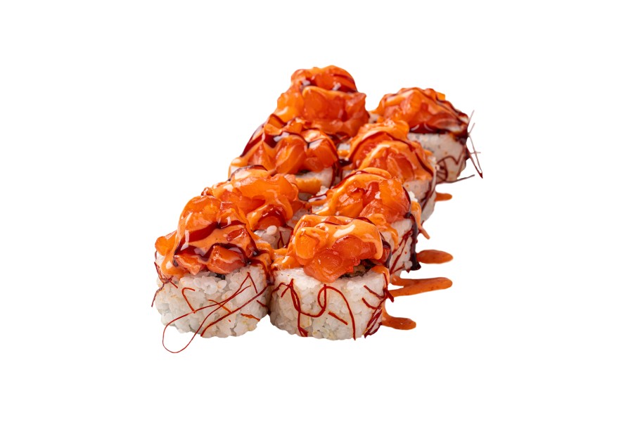 норі, рис, крем-сир, помаранчева ікра масаго, креветка, авокадо, лосось, соус спайсі, нитки чилі